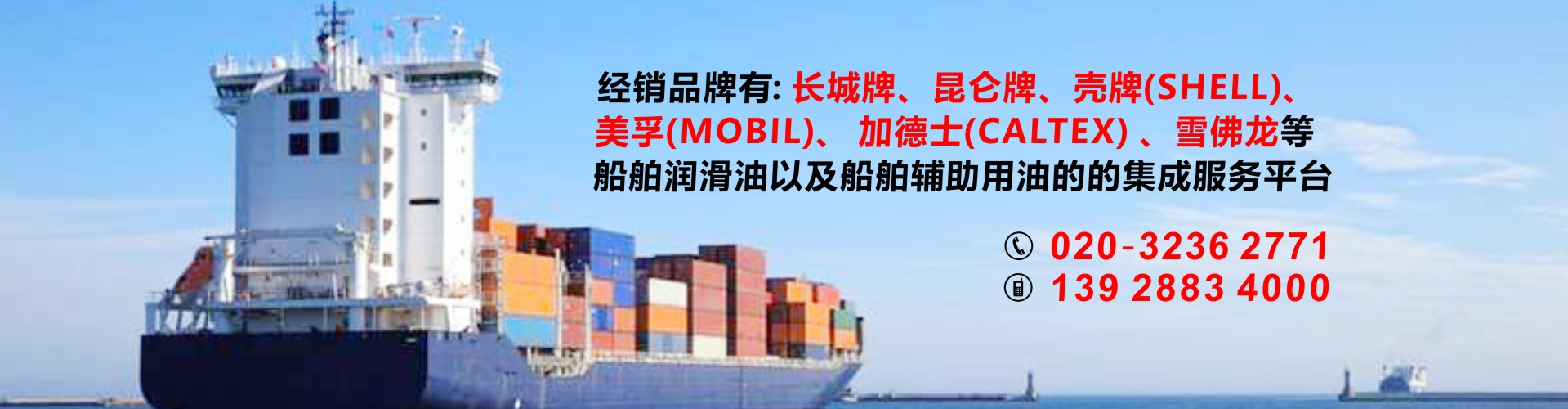 公司代理中石化長城潤滑油以及中石化國際品牌SINOPEC潤滑油,經銷品牌有昆侖牌、殼牌(SHELL)美孚(MOBIL)、加德士(CALTEX)雪佛龍(CHEVRON)是船舶潤滑油以及船舶輔助用油的的集成服務平臺,也可按照船東要求提供船舶消防救生用品、勞保用品、五金燈具及甲板用品等船舶配套產品。